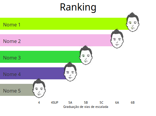 Depois de alguns meses resolvi fazer uma brincadeira criando um ranking simples com os nomes, fotos e um gráfico de barra com os níveis das vias que cada um de nós conseguiu conquistar.
