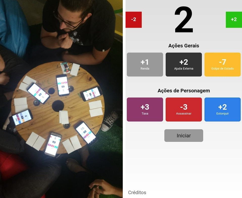 O conceito é simples, cada jogador pode baixar no celular (por enquanto somente Android) os botões são as ações que acrescentam ou subtraem do valor total mostrado na tela.